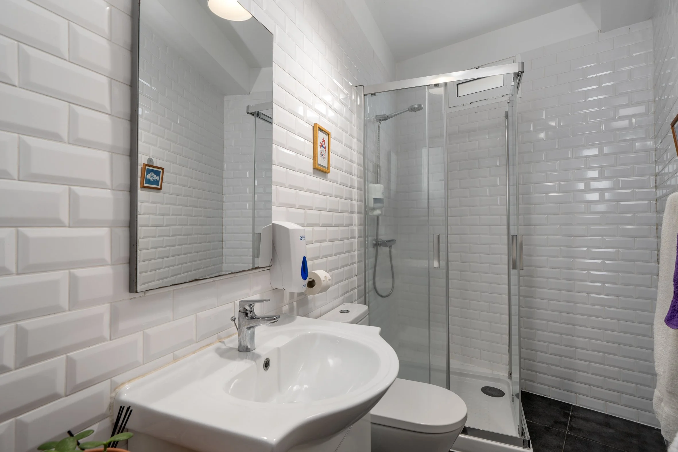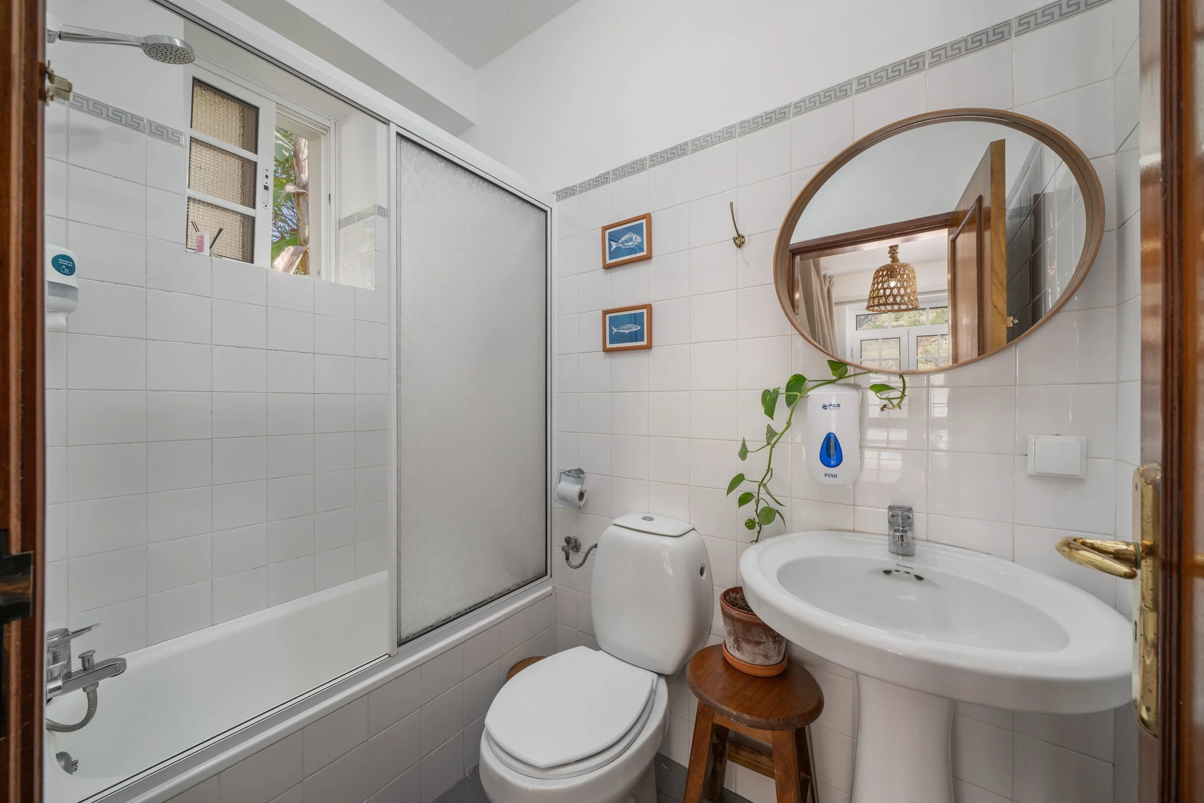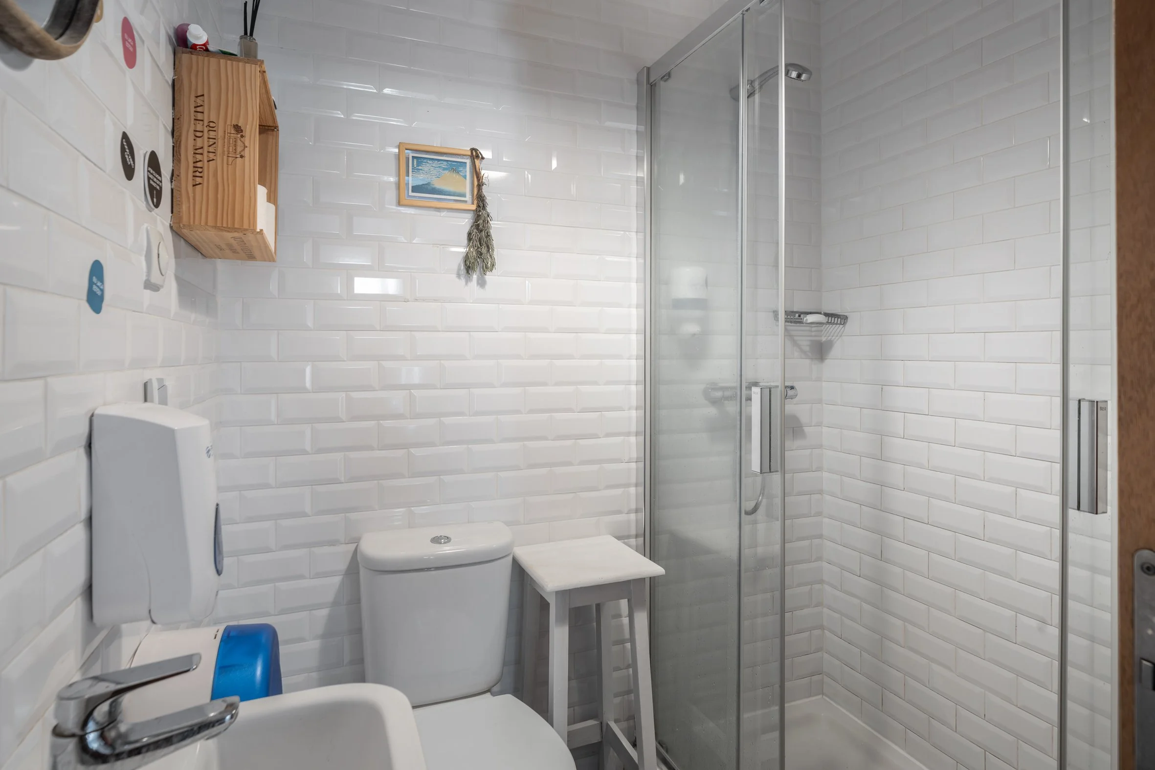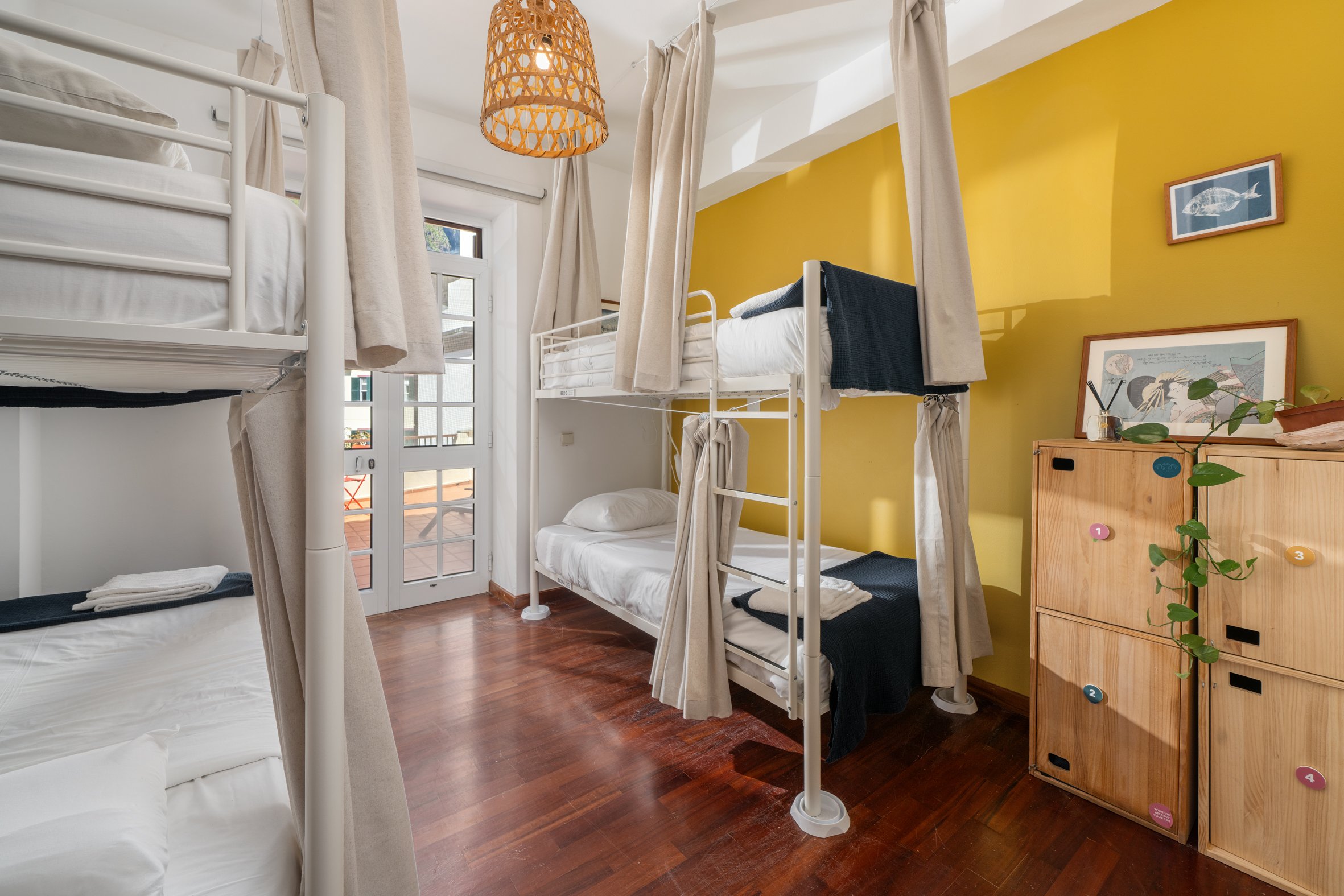 Dormitório com 4 camas e casa de banho. Pontuado com a decoração cozy do Jaca. Este quarto recebe bastante luz e a casa de banho é realmente agradável.