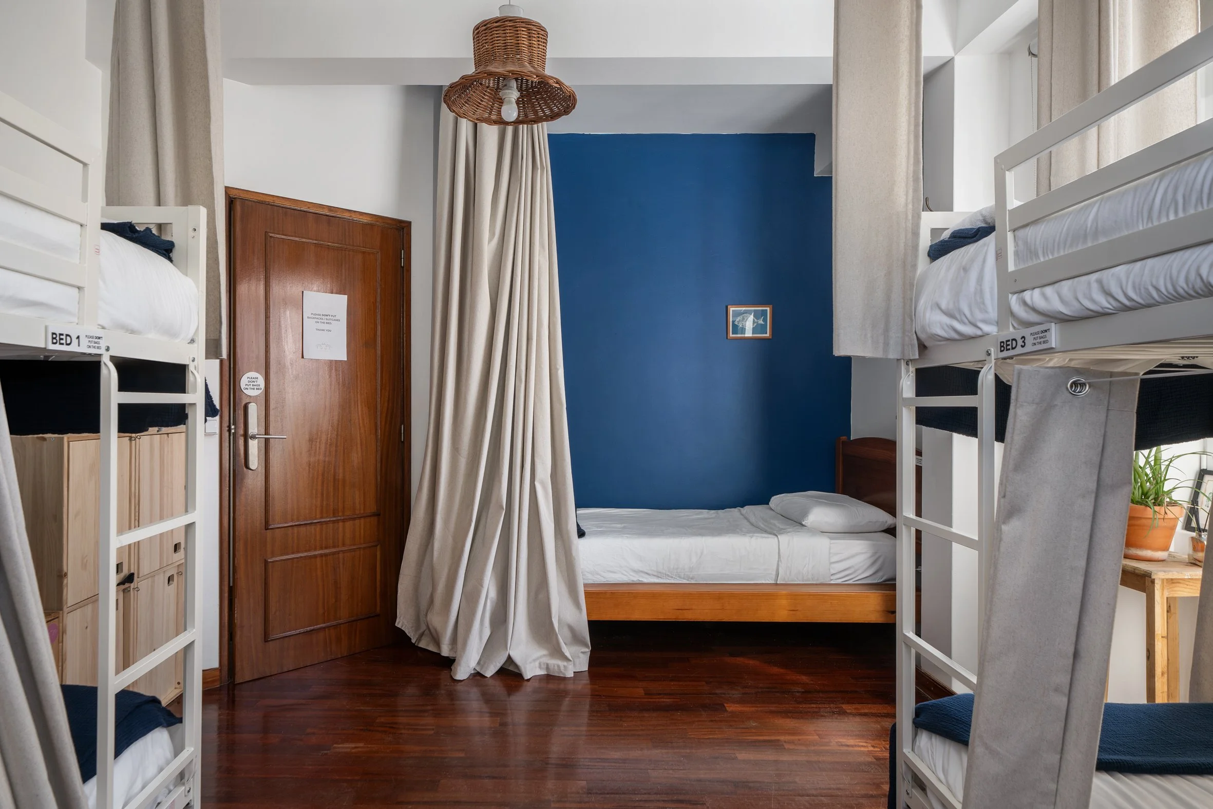 Dormitório com cinco camas. Dois beliches, uma cama individual e casa de banho partilhada. Ideal para backpackers que busquem a experiência comunitária.